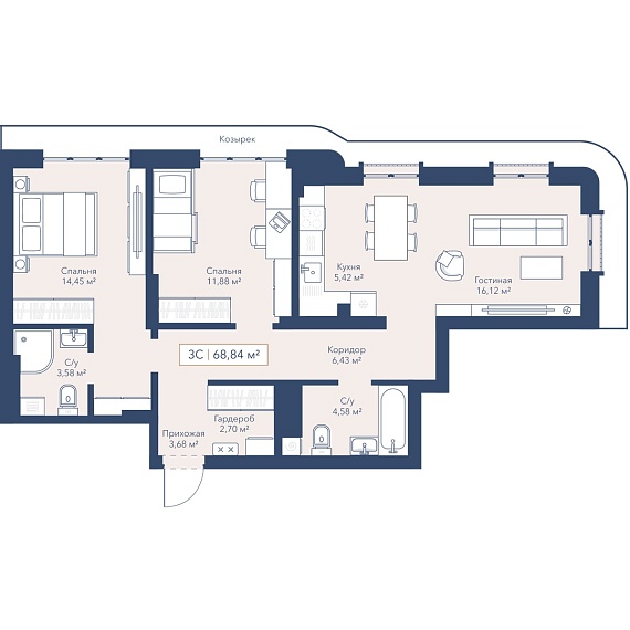 3К квартира 69 м²