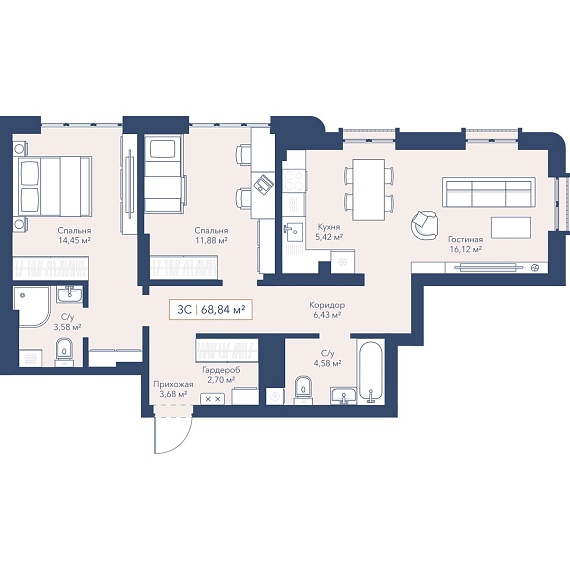 3К квартира 69,1 м²