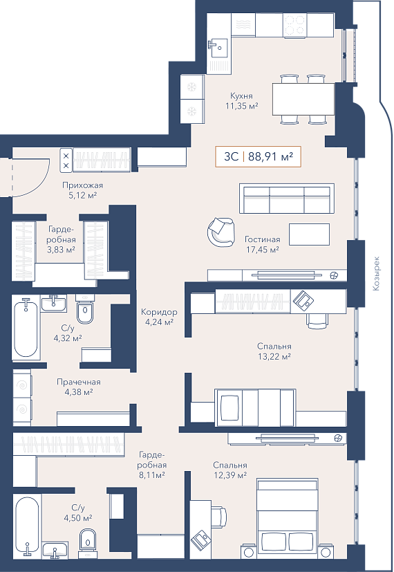 3К квартира 89 м²