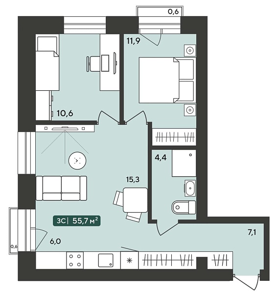 3К квартира 55,7 м²