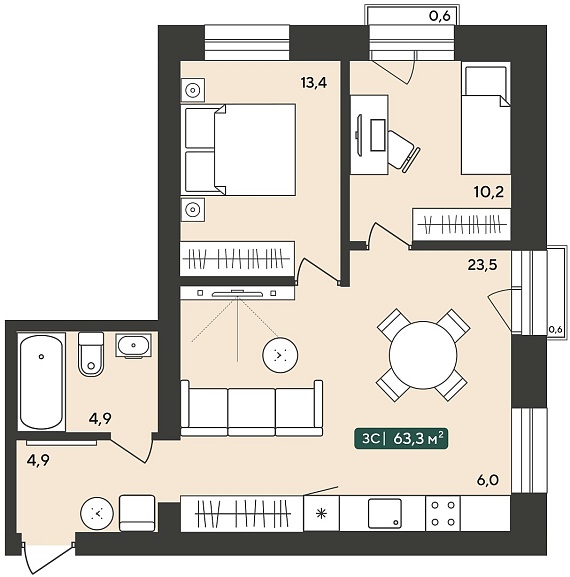 3К студия 63,3 м²
