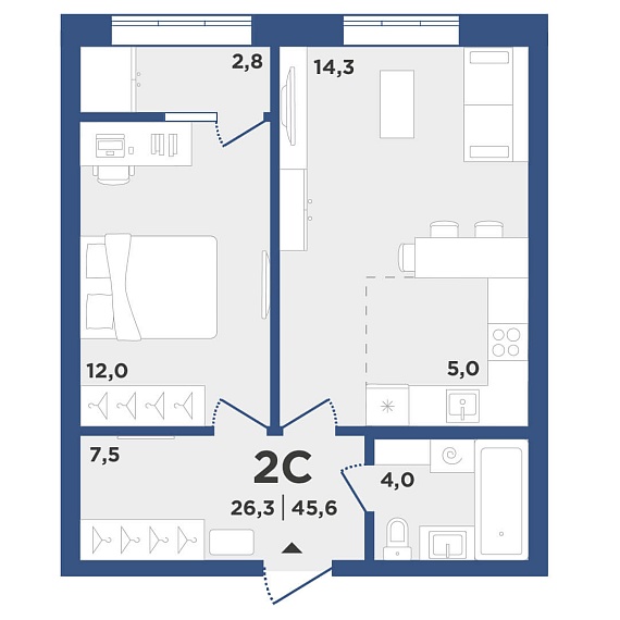 2К квартира 45,6 м²