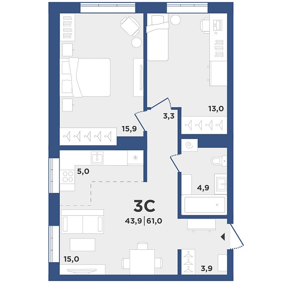3К квартира 61 м²