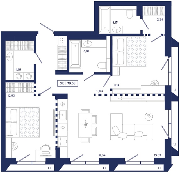 3К квартира 79,08 м²