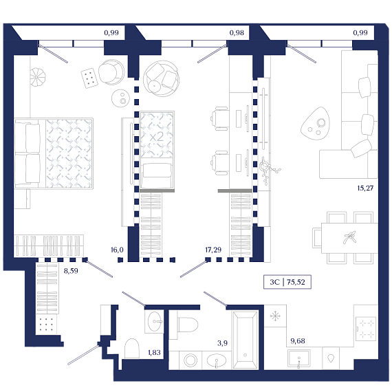 3К квартира 75,52 м²