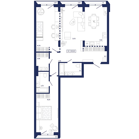 3К квартира 105,03 м²