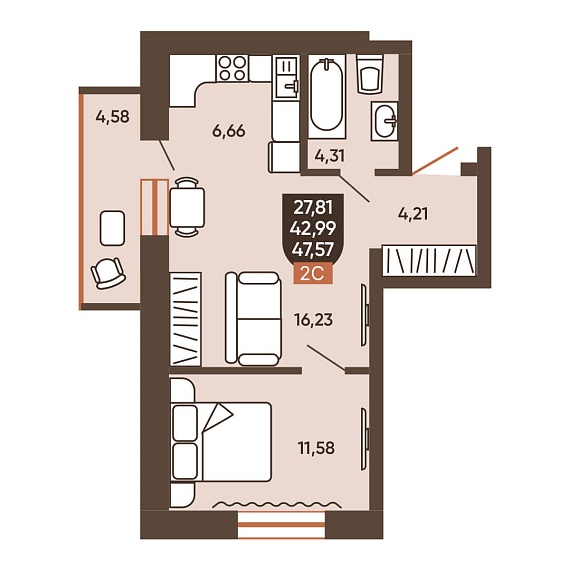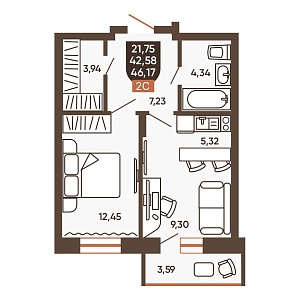 2К квартира 47,57 м²
