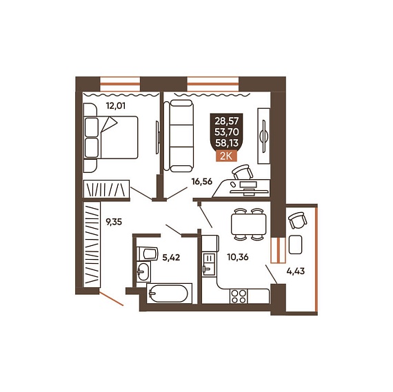 2К квартира 58,13 м²
