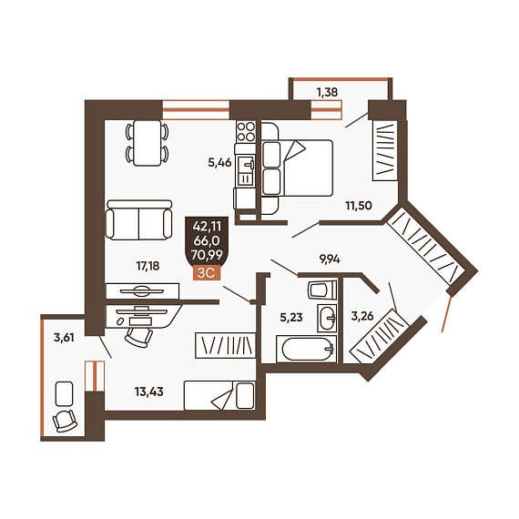 Представлены варианты квартир-студий от 27,26 м² до просторных трёхкомнатных планировок площадью 90,15 м² с мастер-спальнями и гардеробными