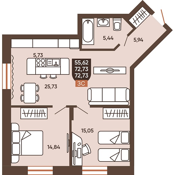 Представлены варианты квартир-студий от 27,26 м² до просторных трёхкомнатных планировок площадью 90,15 м² с мастер-спальнями и гардеробными