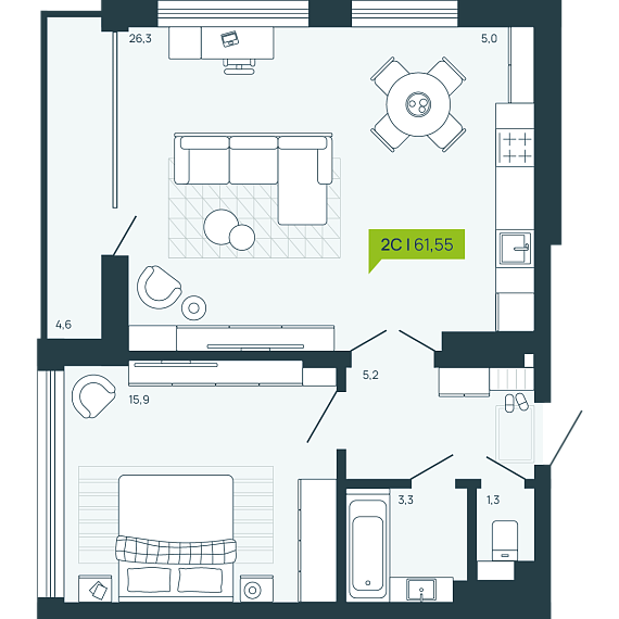 2К студия 61,55 м²