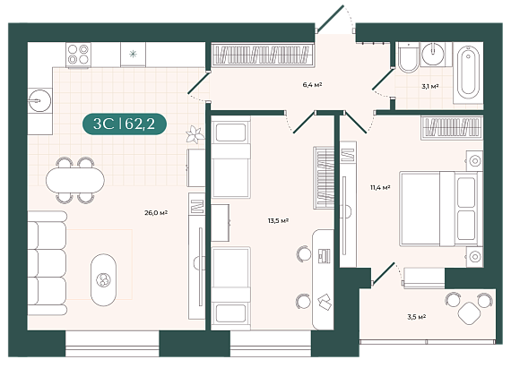 3К студия 62,15 м²