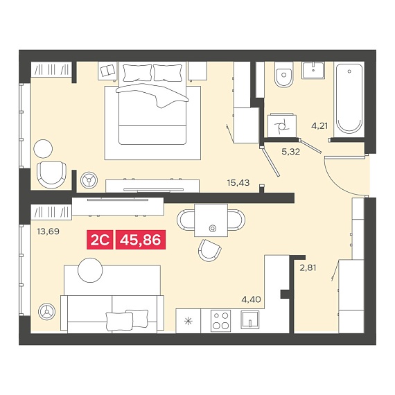 2К студия 45,86 м²