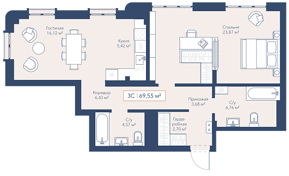 3К студия 69,55 м²
