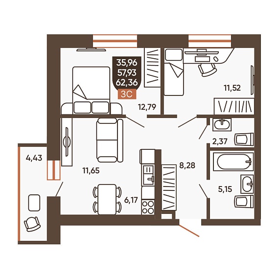 Представлены варианты квартир-студий от 27,26 м² до просторных трёхкомнатных планировок площадью 90,15 м² с мастер-спальнями и гардеробными