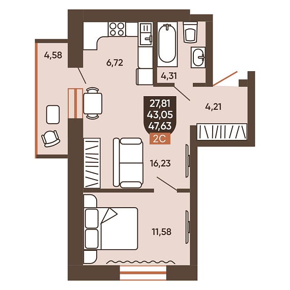 Представлены варианты квартир-студий от 27,26 м² до просторных трёхкомнатных планировок площадью 90,15 м² с мастер-спальнями и гардеробными