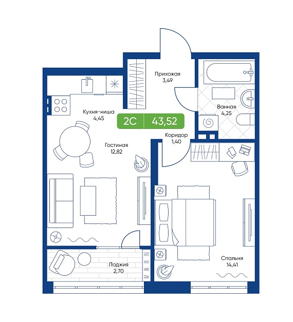 2К студия 43,52 м²