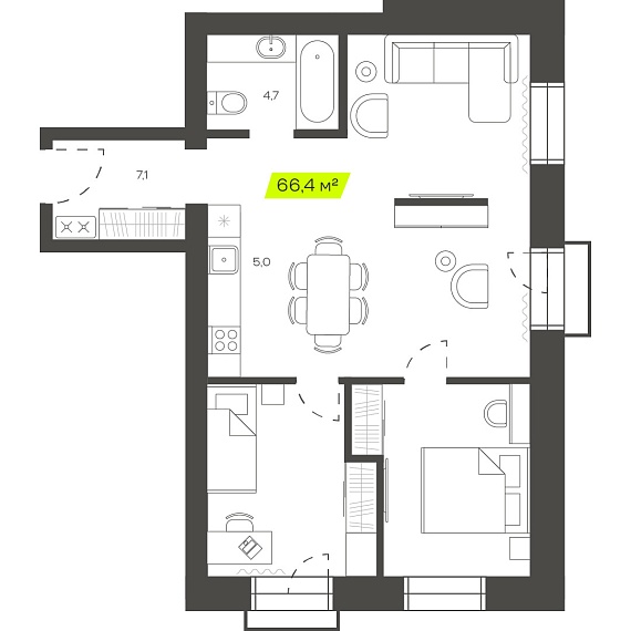 3К квартира 66,44 м²