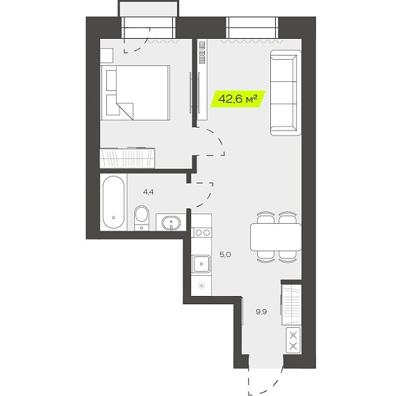 2К студия 42,56 м²
