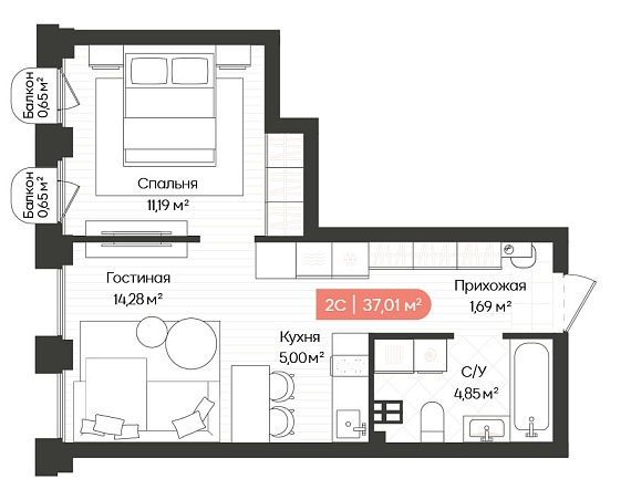 2К квартира 38,31 м²