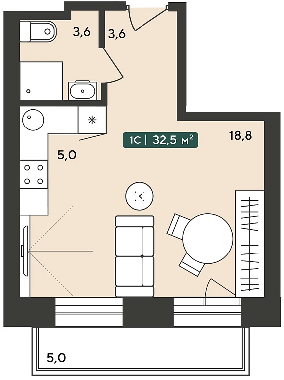 1К квартира 32,5 м²