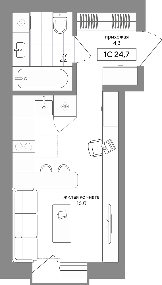 1К студия 24,66 м²