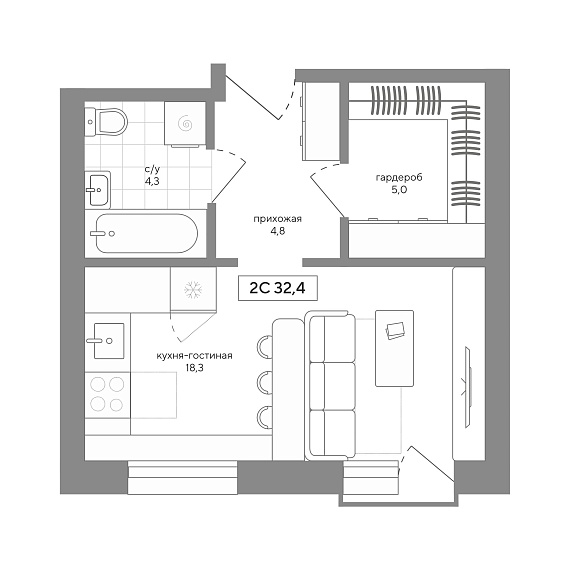1К квартира 32,39 м²