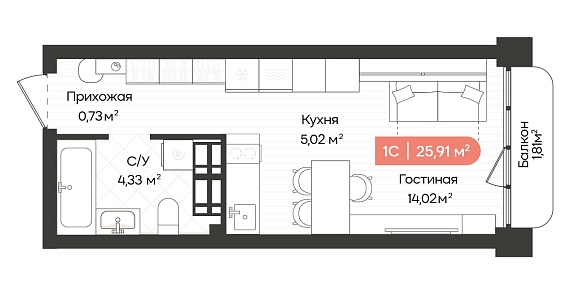 1К студия 25,91 м²
