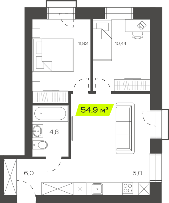 2К студия 54,89 м²