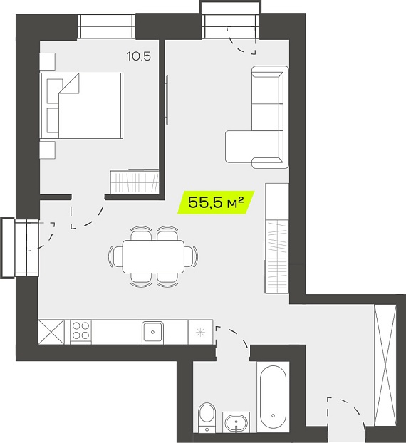 2К студия 55,5 м²