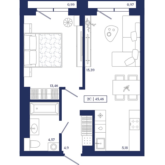 2К квартира 45,46 м²