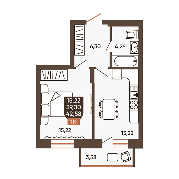1К квартира 42,58 м²