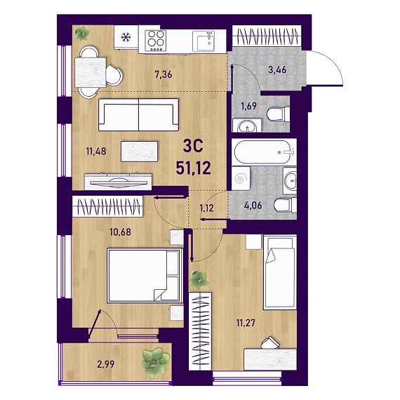 3К студия 51,12 м²