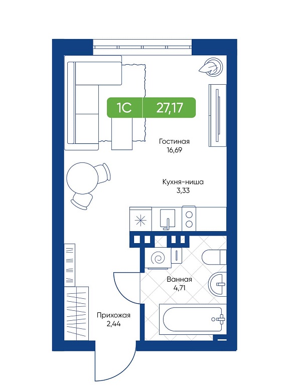 1К студия 27,17 м²