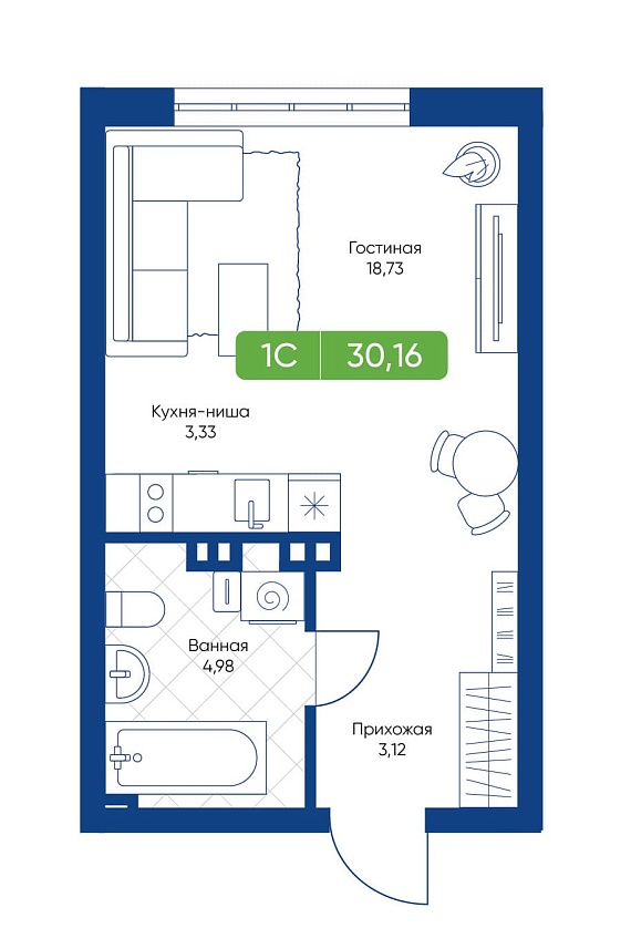 1К студия 30,16 м²