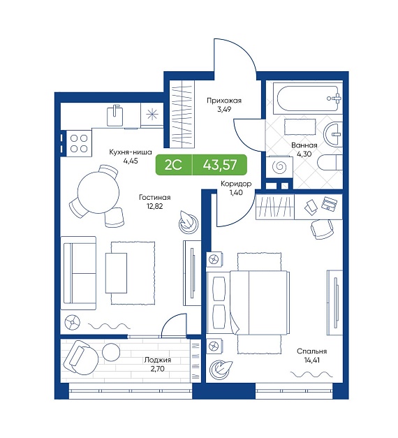 2К студия 43,57 м²
