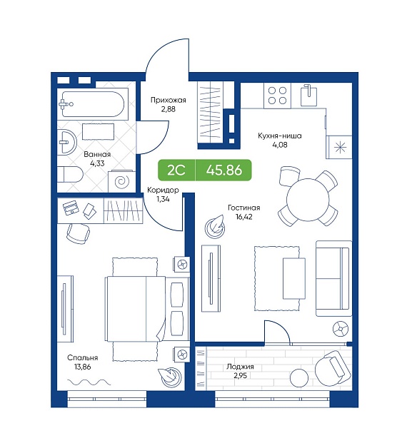 2К студия 45,86 м²