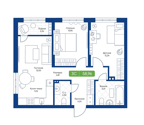 3К студия 58,96 м²