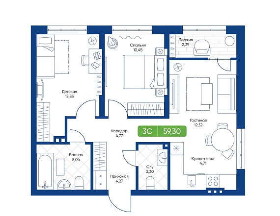 3К студия 59,3 м²