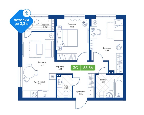 3К студия 58,86 м²