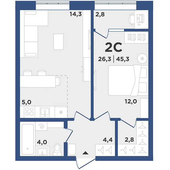 2К студия 45,3 м²