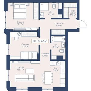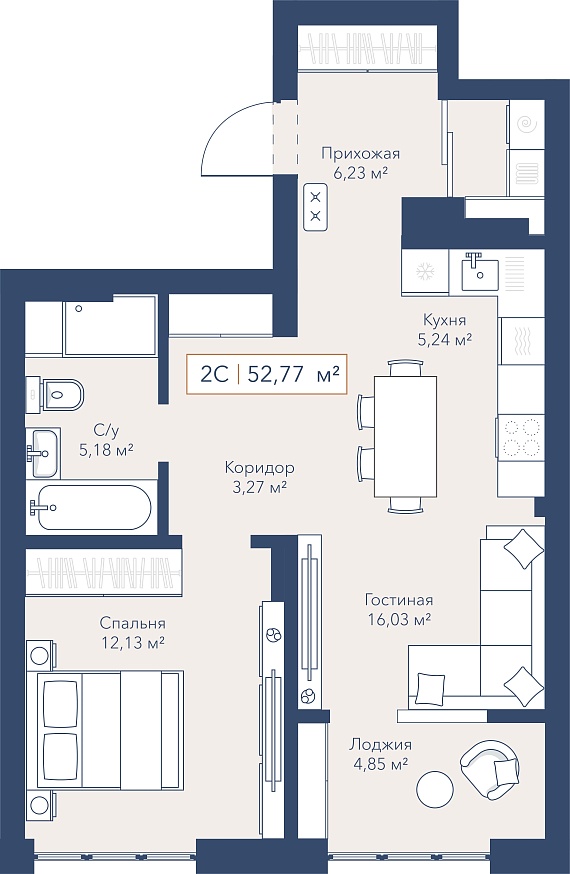 2К квартира 52,77 м²