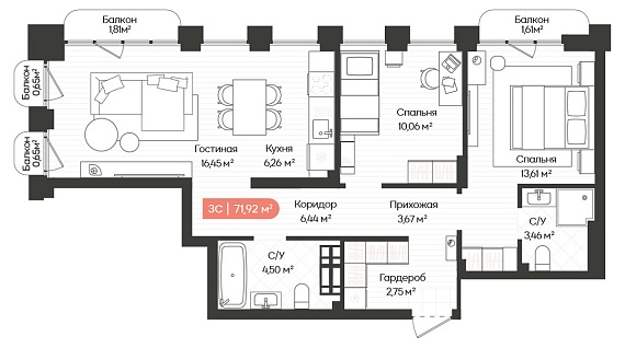 3К квартира 71,92 м²