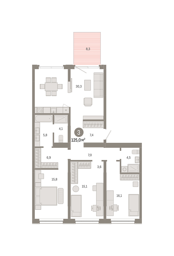 3К квартира 124,98 м²