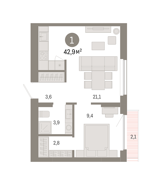 1К квартира 42,9 м²