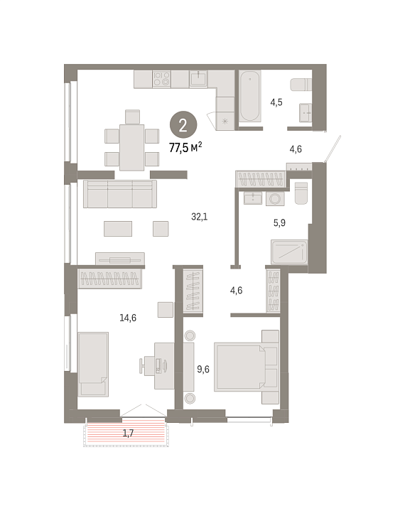 2К квартира 77,46 м²