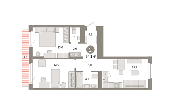 2К квартира 64,08 м²