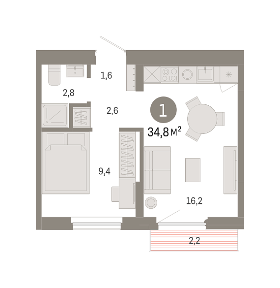 1К квартира 34,76 м²