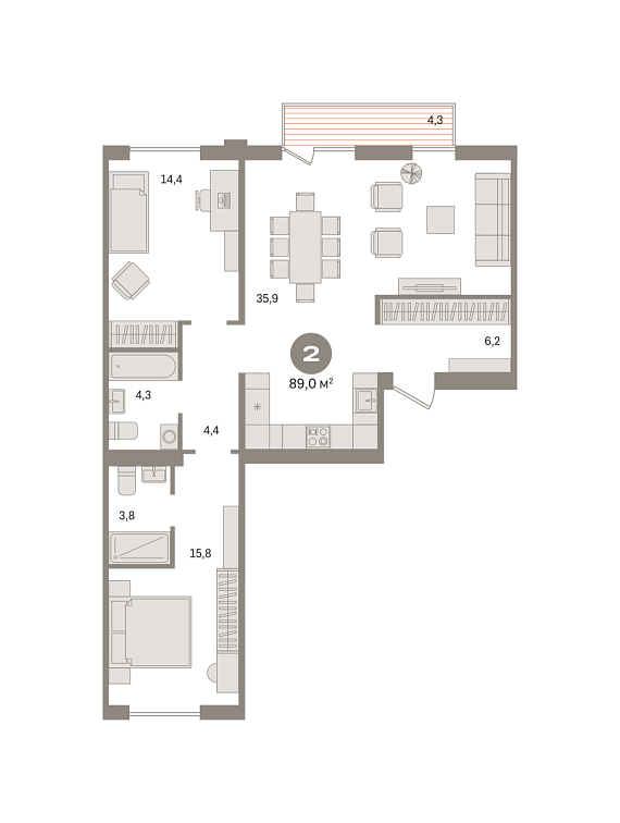 2К квартира 88,95 м²
