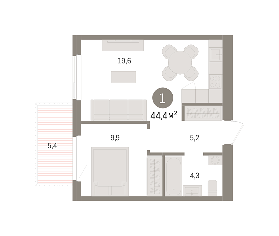 1К квартира 44,36 м²